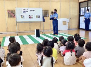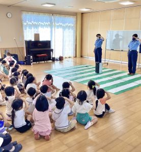 年長児のぞう組さん、年中児のぱんだ組さん、年少児のきりん組さんを対象に、警察の方にお越しいただき、交通安全についてのお話をしていただきました♪