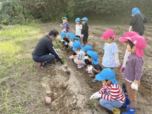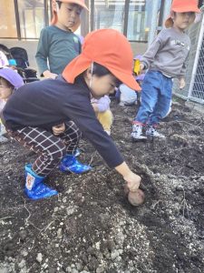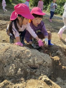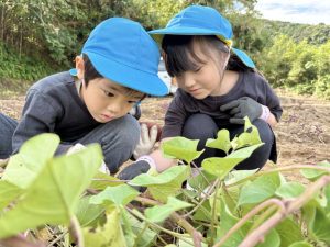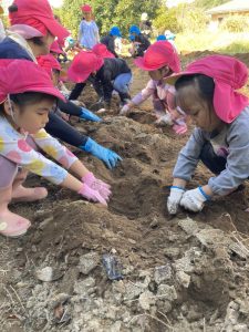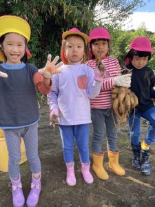 10月末、年長児のぞう組さんと年中児のぱんだ組さんはお芋畑へ、2歳児のうさぎ組さんは園内の畑でお芋掘りをしました!