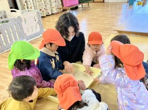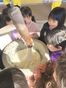 年長児のぞう組さんが1人ずつお餅をつき、お友達は「よいしょー!よいしょー!」の掛け声☆